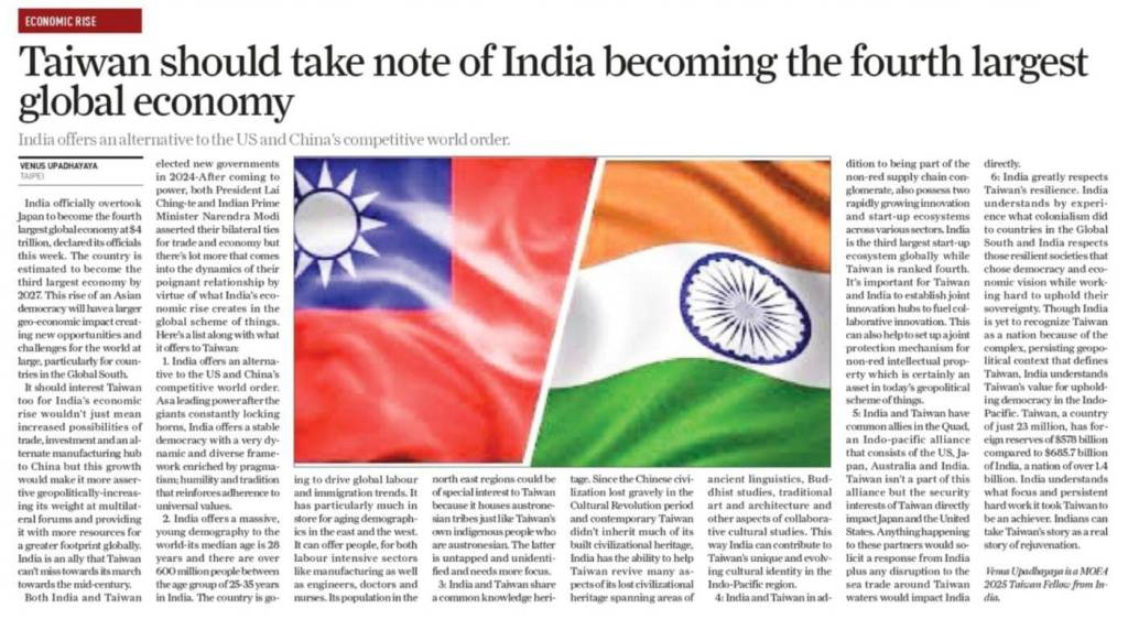 Both India and Taiwan elected new governments in 2024–After coming to power, both President Lai Ching-te and Indian Prime Minister Narendra Modi asserted their bilateral ties for trade and economy but there’s lot more that comes into the dynamics of their poignant relationship by virtue of what India’s economic rise creates in the global scheme of things. Here’s a list along with what it offers to Taiwan: